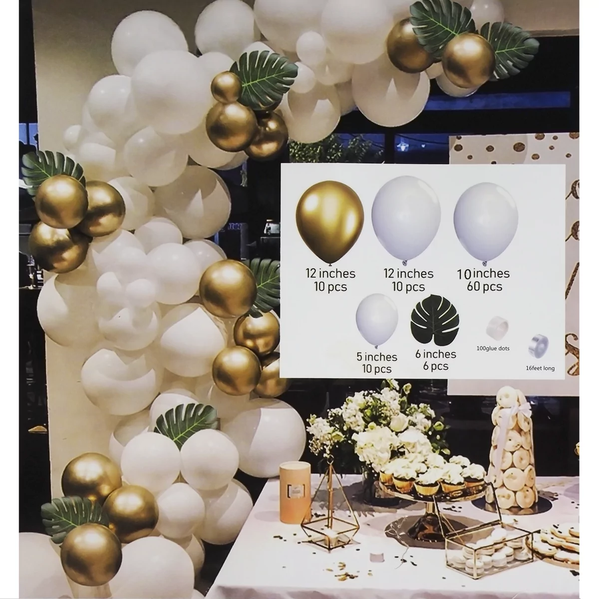Arcada baloane alb, auriu, cu frunze decorative