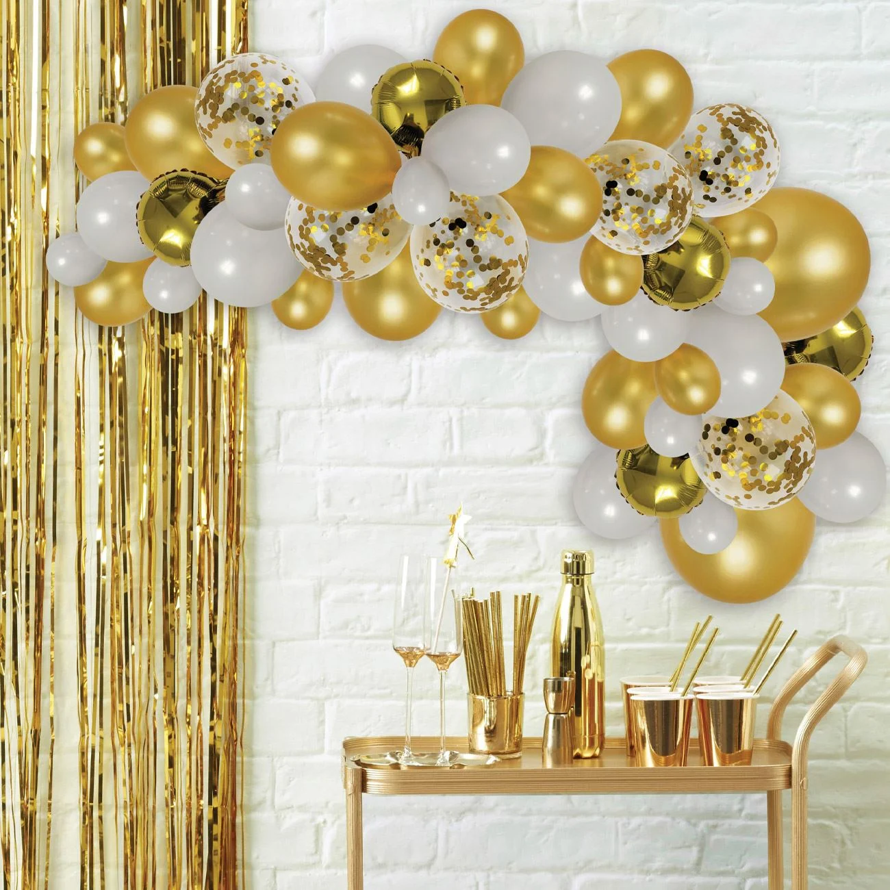 Arcada baloane aniversare petrecere, culori auriu si alb, cu baloane confetti