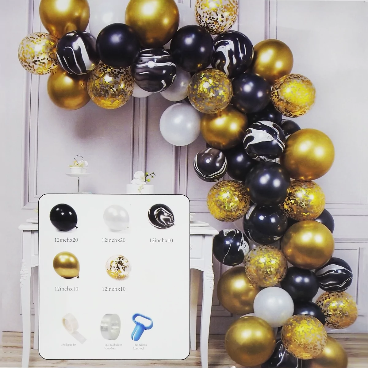 Arcada baloane aurii, negre, albe