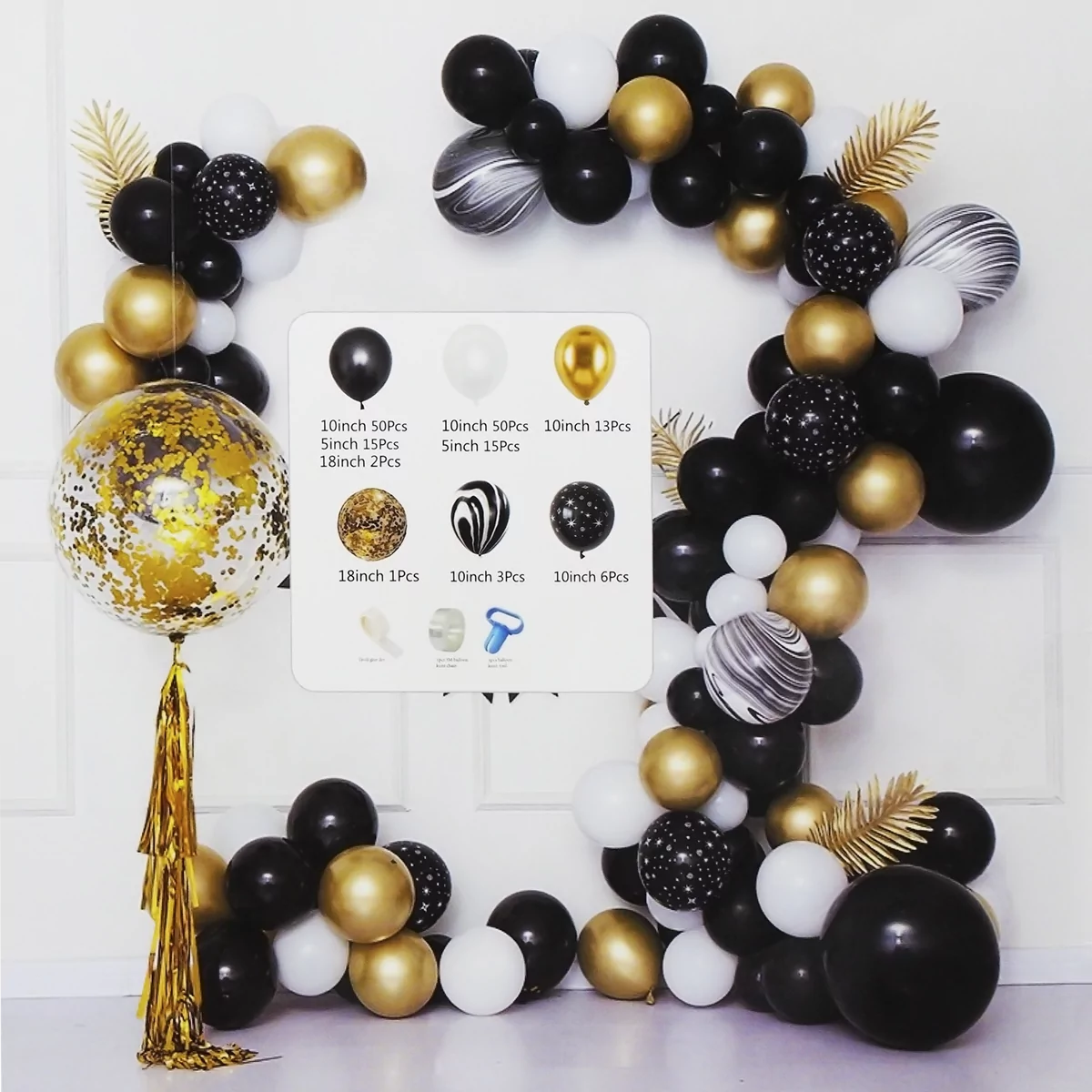 • 113x baloane latex 25 cm alb, negru, auriu.