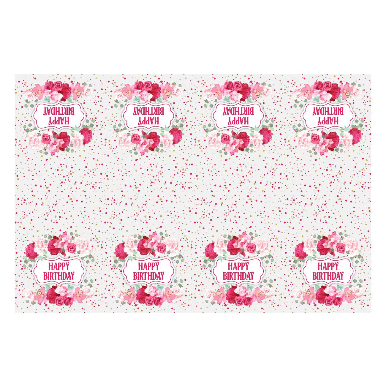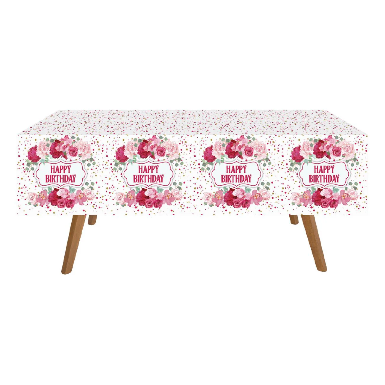 Fata de masa Happy Birthday, cu trandafiri. Dimensiuni 180 x 120 cm. Material folie de plastic.