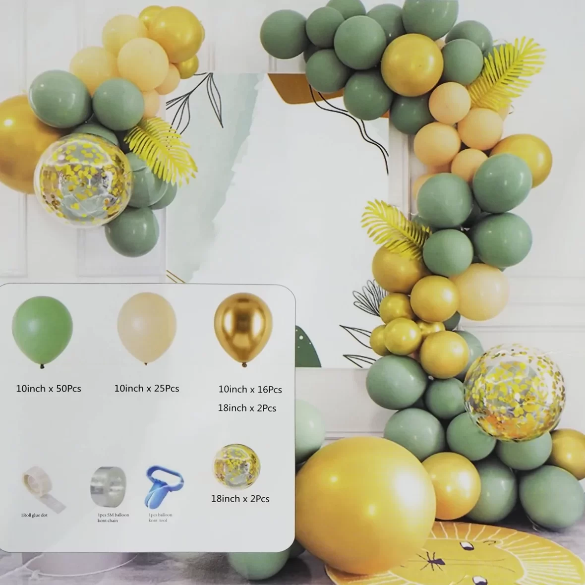 Set aranjament bundle Arcada 94 baloane verzi, auriu si somon cu Confetti