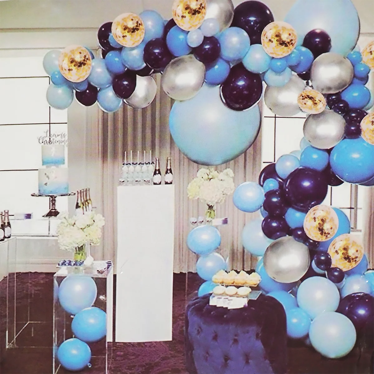 Set arcada 99 baloane in nuante de albastru cu argintiu si baloane confetti