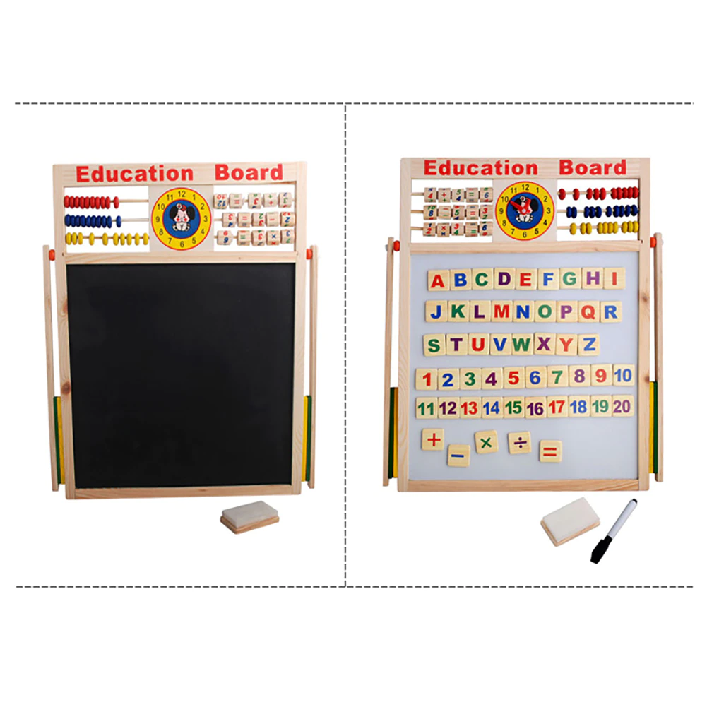 Tabla magnetica din lemn pentru copii, 2 suprafete, cu litere, cifre si accesorii